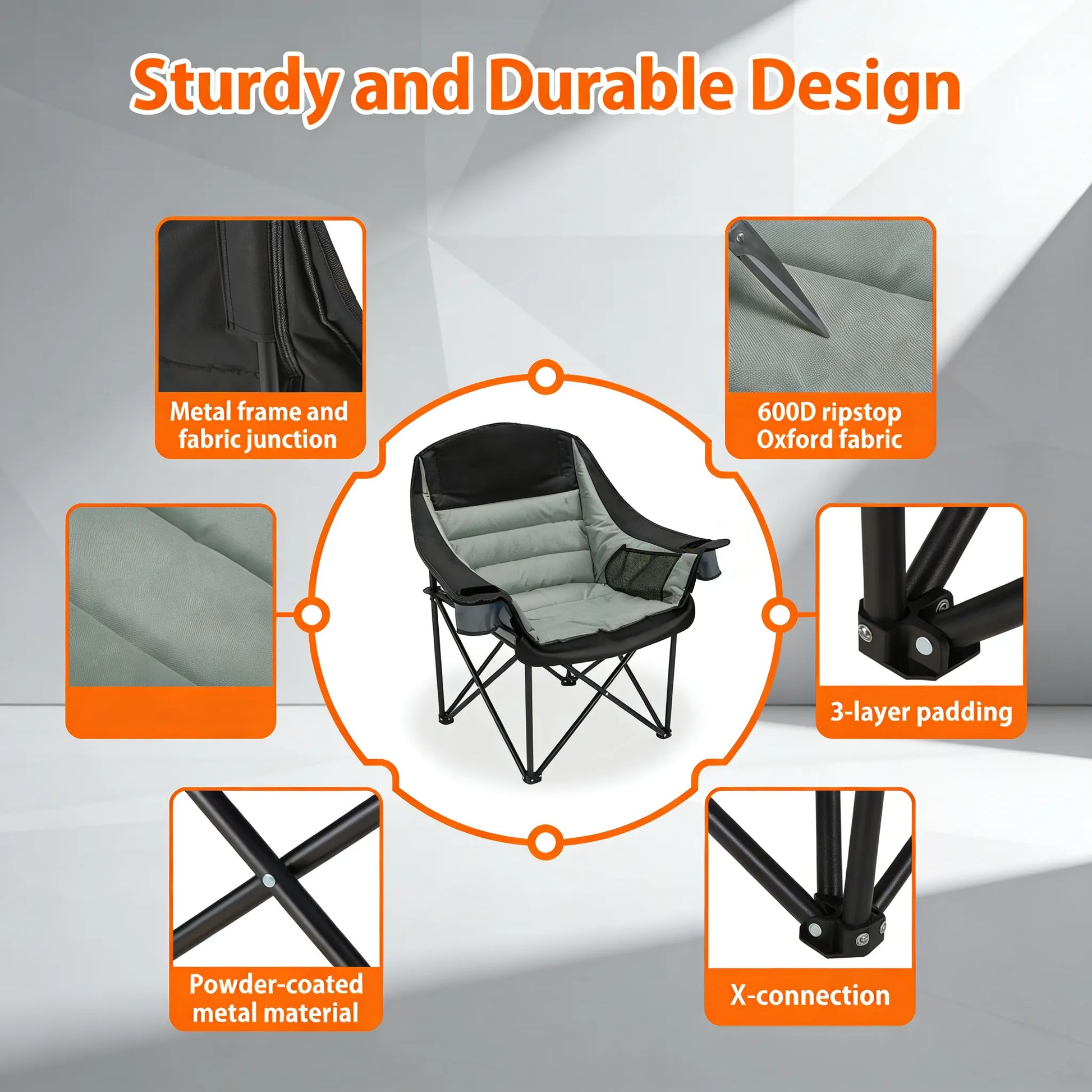 Designed with ergonomic principles, this heavy-duty camping chair for adults offers a spacious seat with unfolded dimensions of 40.5″ L × 28″ W × 39″ H. High-loft, high-density padding is added to the headrest, backrest, armrests, and seat cushion, providing ample support for your head, neck, back, waist, and hips—ensuring comfort even during long periods of sitting.